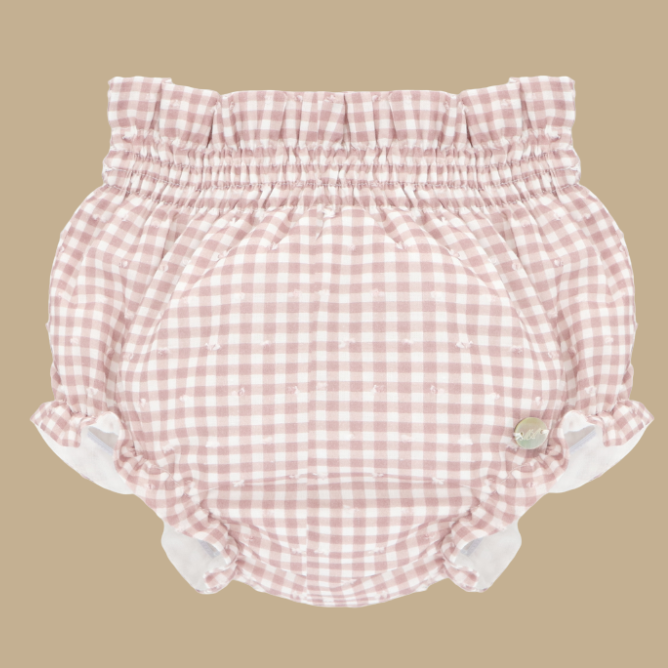 La braguita a juego, confeccionada en plumeti con cuadrito vichy, cuenta con cintura y perneras elásticas para un ajuste cómodo y perfecto, sin apretar. Su diseño está pensado para acompañar el movimiento del bebé manteniendo siempre una caída bonita.