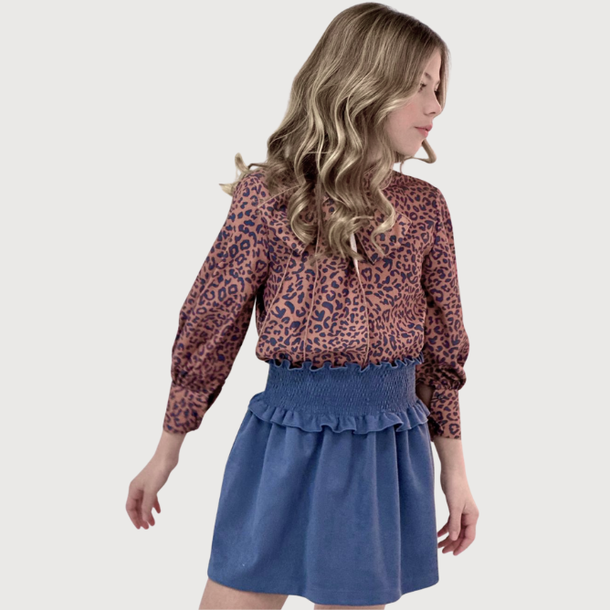 Conjunto compuesto por blusa animal print y falda azul con volantes.