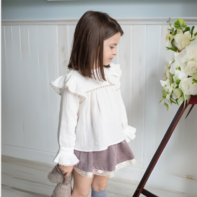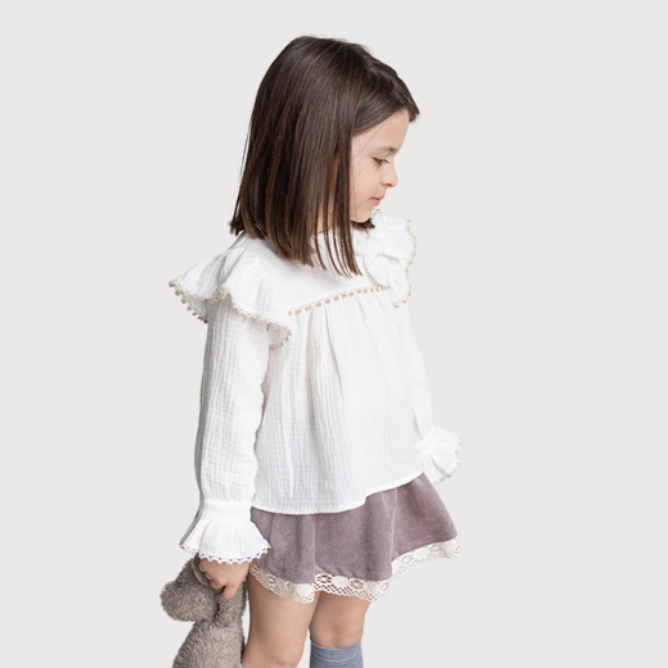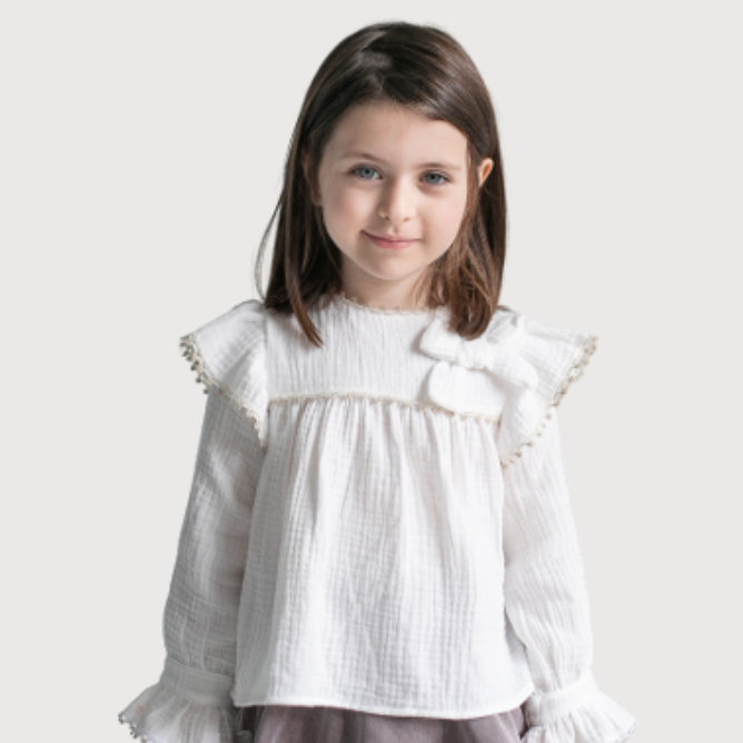 La blusa blanca de manga larga destaca por su textura suave y ligera, con volantes en los hombros y puños, además de un lazo decorativo en el pecho que aporta un toque coqueto.