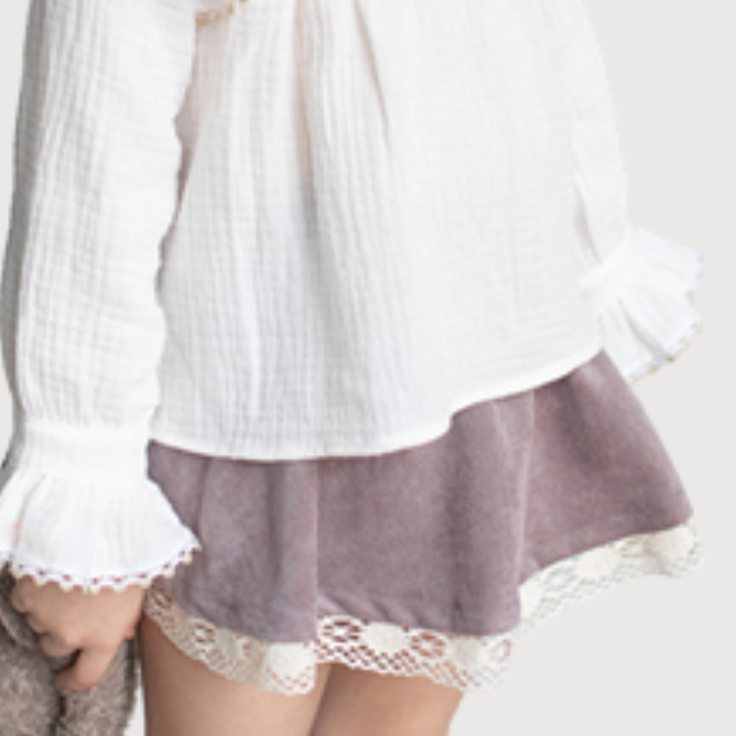 La faldita pantalón en tono malva se adorna con delicados detalles de encaje en el bajo, creando un contraste romántico y lleno de encanto.