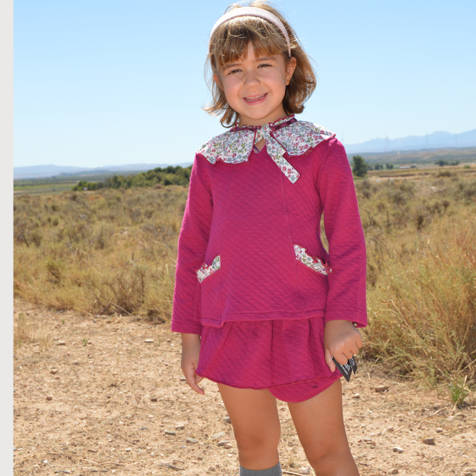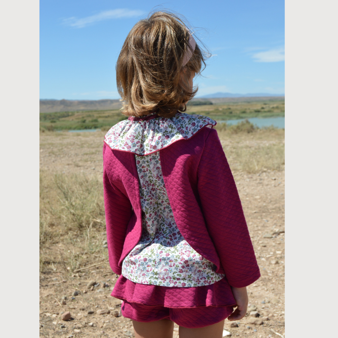 Conjunto de sudadera y falda con volantes en color buganvilla.