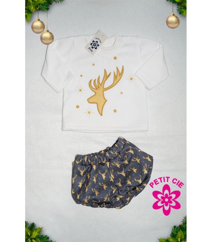 Conjunto Reno Navidad Niño Andrea Lovers , un diseño encantador y práctico, perfecto para la Navidad. Este conjunto incluye una sudadera 100% algodón blanca con el dibujo de un reno y un pantalón bombacho forradito con el estampado de reno y muy forrado , ideal para eventos especiales navideños