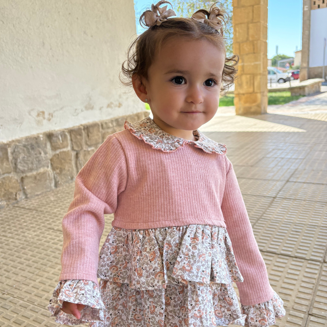 La parte superior en tono rosa empolvado destaca por su diseño con volantes dobles en tejido floral, que aportan movimiento y un aire romántico.