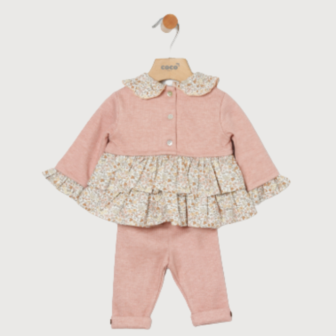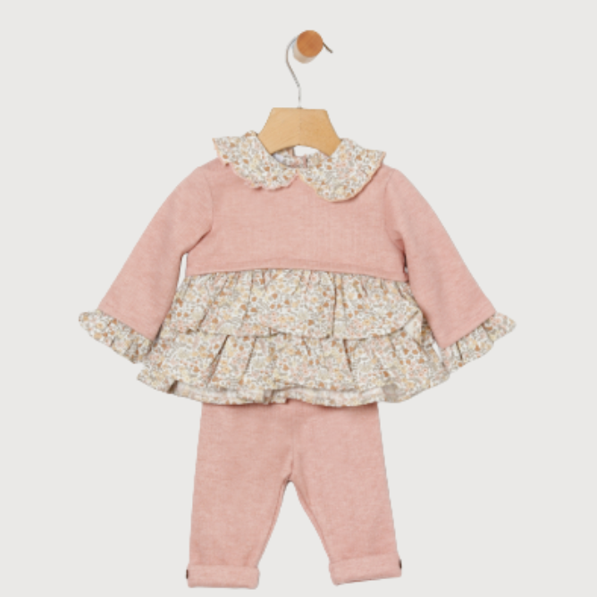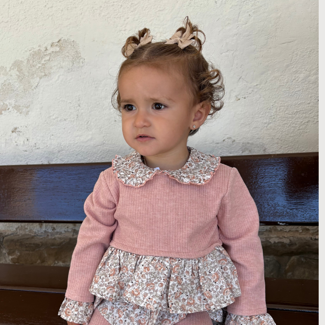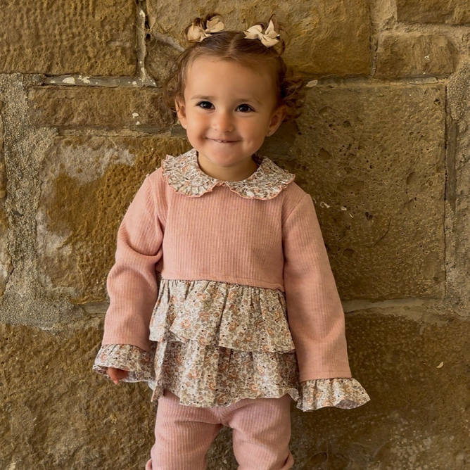 Las mangas llevan un remate de volante floral a juego, logrando un conjunto armónico y cuidado. Se acompaña de unos leggins rosas que aportan comodidad y practicidad, ideal para el día a día sin renunciar al estilo.