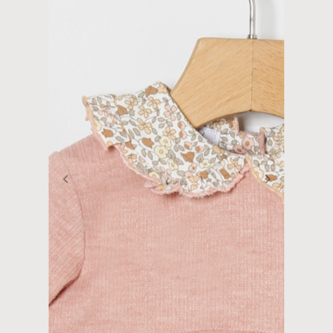 El cuello bebé en el mismo estampado floral completa el diseño con un toque clásico y delicado.