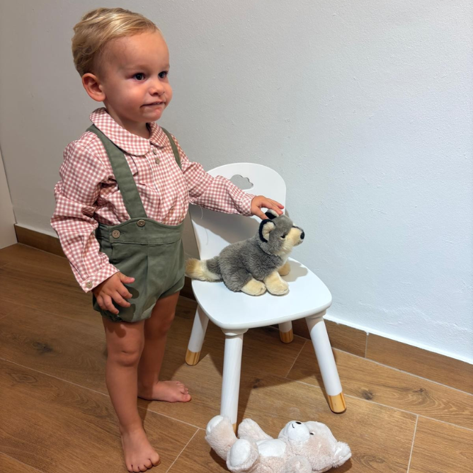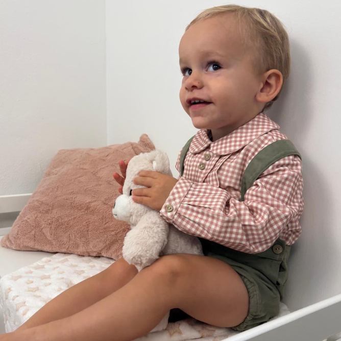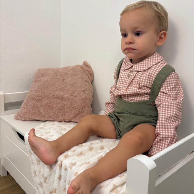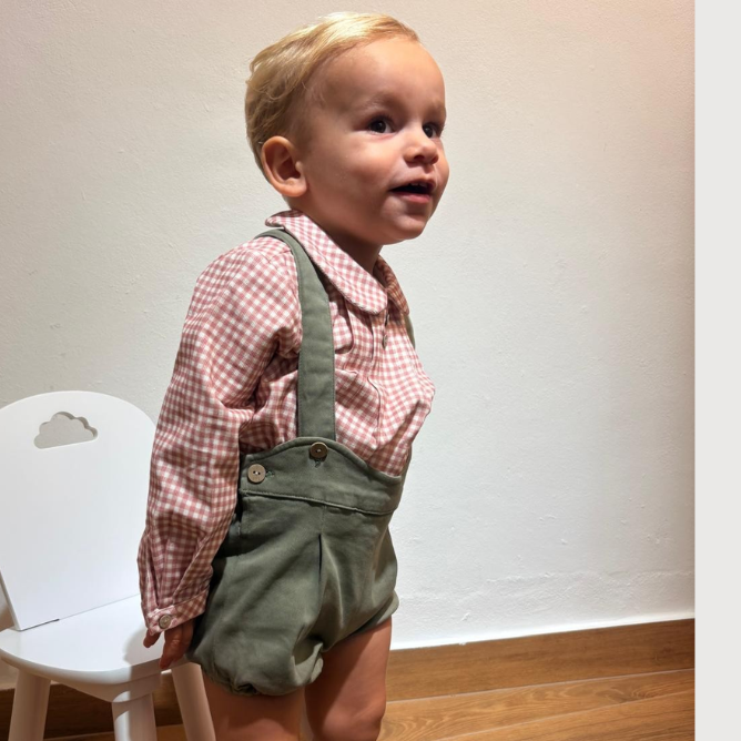 La ranita en color verde suave con tirantes abotonados y detalle fruncido en las perneras completa el look, ofreciendo comodidad y un ajuste perfecto para los más pequeños. Los botones en madera clara aportan un toque natural que realza el diseño.