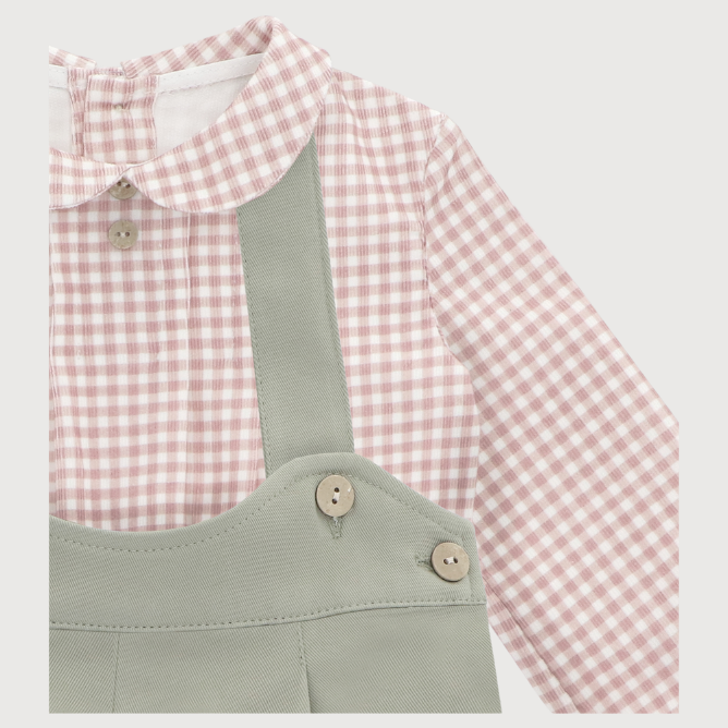 Este conjunto combina dulzura y estilo clásico en una sola prenda. La camisa de manga larga con estampado de cuadros vichy en tono rosa y cuello redondo aporta un aire tierno y atemporal. Se abrocha cómodamente en la parte trasera, garantizando facilidad de uso.