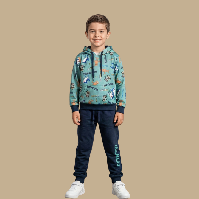 Este conjunto infantil combina una sudadera con capucha, suave y cómoda, con un pantalón largo diseñado para acompañarles en todo lo que hacen: correr, saltar, agacharse, volver a correr… y no parar.