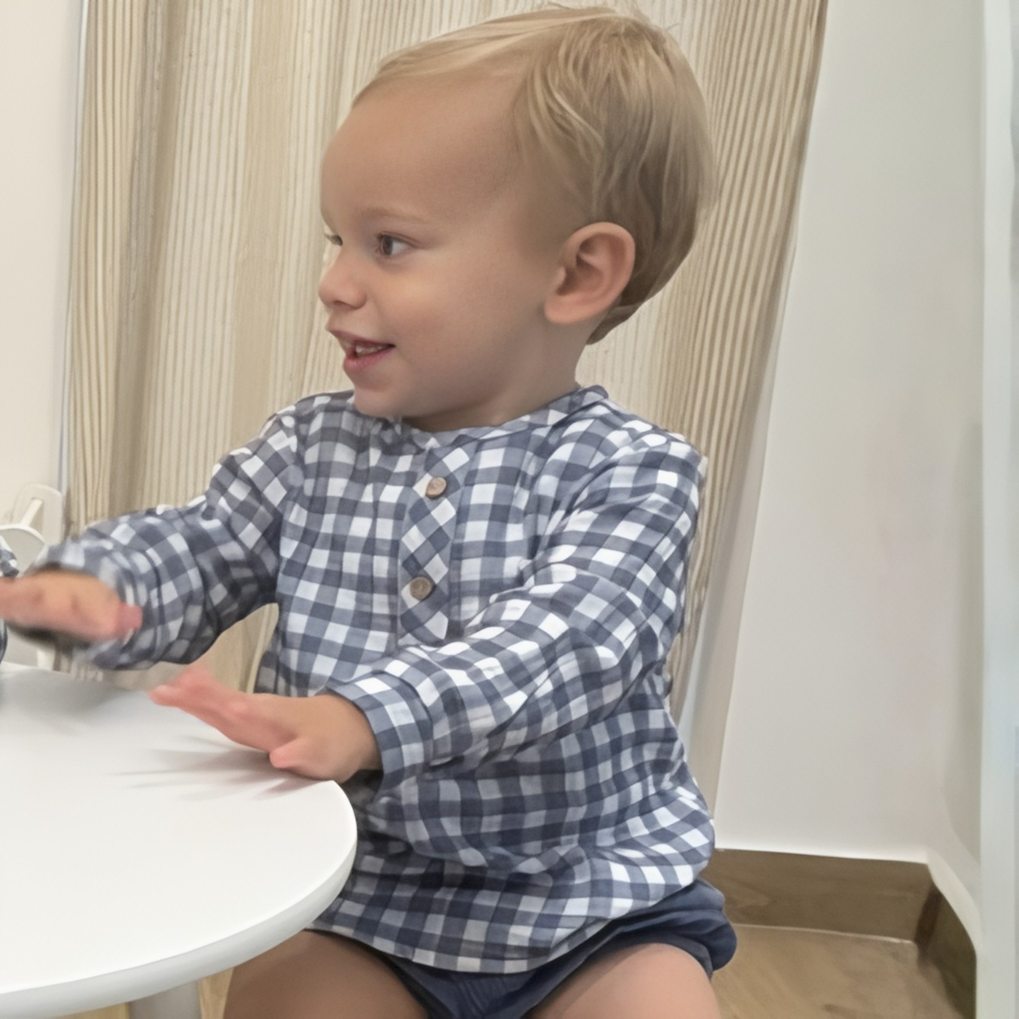 La blusa de manga larga en vichy azul y blanco en tonos suaves aporta frescura y dulzura, mientras que el cuello volante con detalle en rosa a cuadros añade un aire coqueto y original.