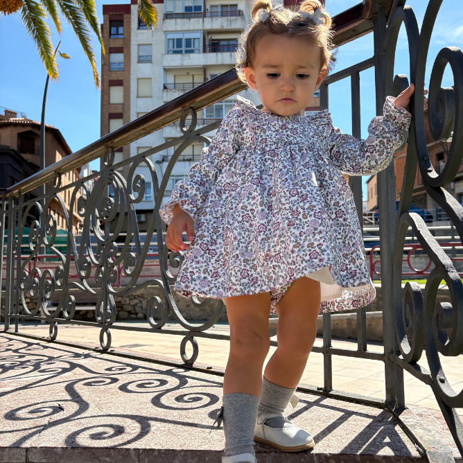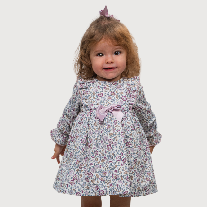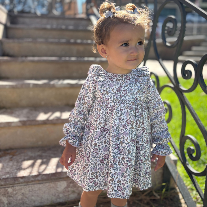 Su estampado floral en tonos lilas, rosas y verdes destaca por su delicadeza y su aire romántico, perfecto para las más pequeñas.
