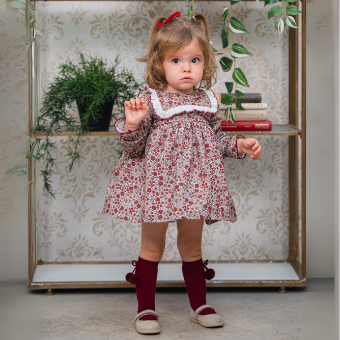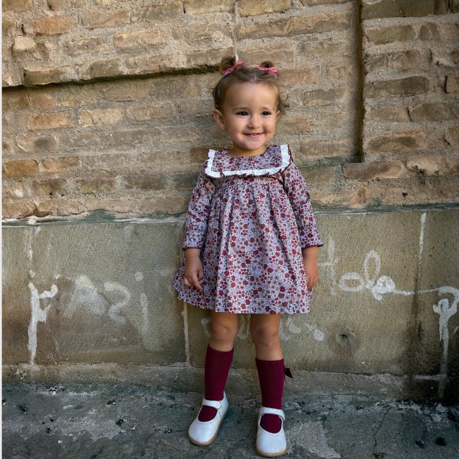 Las mangas terminan en puños fruncidos que aseguran comodidad y estilo. La falda en color burdeos completa el conjunto con un diseño de talle alto y ligero vuelo, creando un contraste sofisticado y equilibrado.