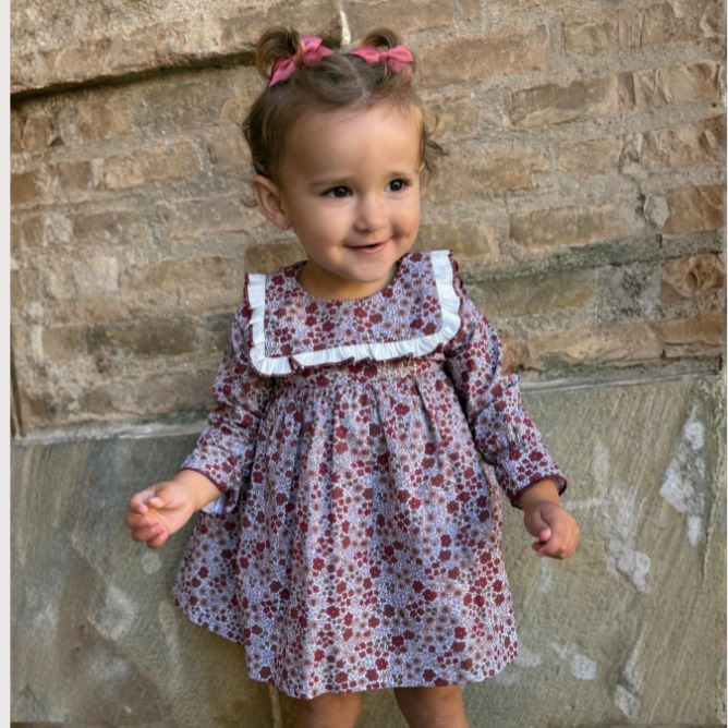 La blusa de manga larga con estampado floral en tonos suaves destaca por su delicadeza, con cuello subido y pequeños volantes en los hombros que aportan un toque coqueto y romántico.