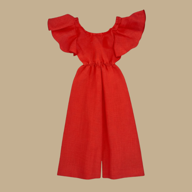 Este precioso mono infantil destaca por su diseño sofisticado y actual, confeccionado en un tejido de aspecto ligero y natural que aporta frescura y comodidad. Su intenso color rojo realza la prenda y la convierte en una opción ideal para eventos, celebraciones o looks especiales con estilo.