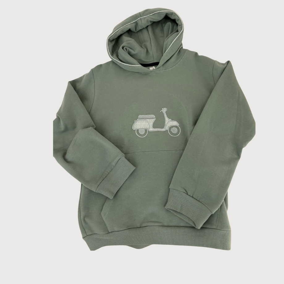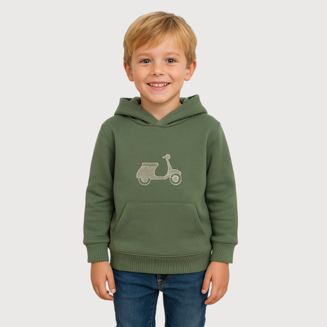 Sudadera infantil en tono verde, cómoda y con un diseño sencillo pero muy especial. Con capucha y acabado suave, destaca por su bordado central de scooter, un detalle discreto que aporta un aire divertido y actual.