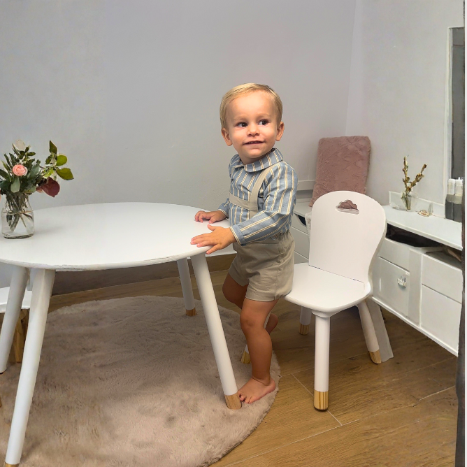 Un conjunto clásico y elegante pensado para los más pequeños. La camisa en tono azul con rayas beige aporta frescura y estilo, con cuello redondo y manga larga que realzan un aire tradicional y atemporal.