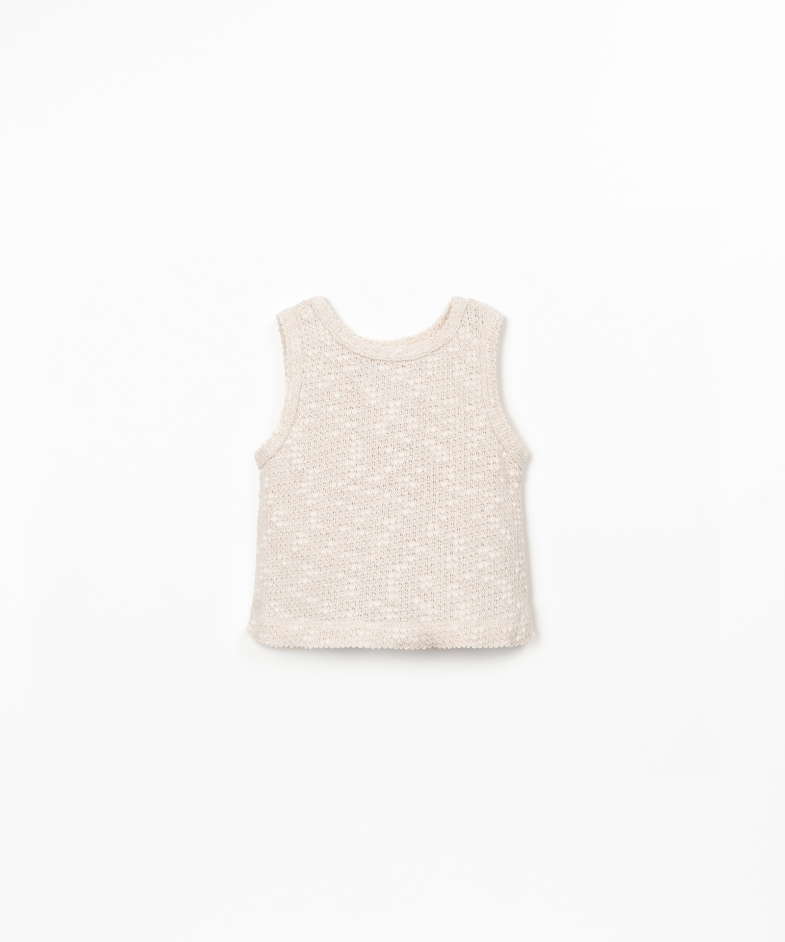 Top confeccionado en algodón orgánico 100%, suave y respetuoso con la piel. Presenta un delicado color claro natural y un tejido de punto ligero que aporta un estilo sencillo y atemporal.