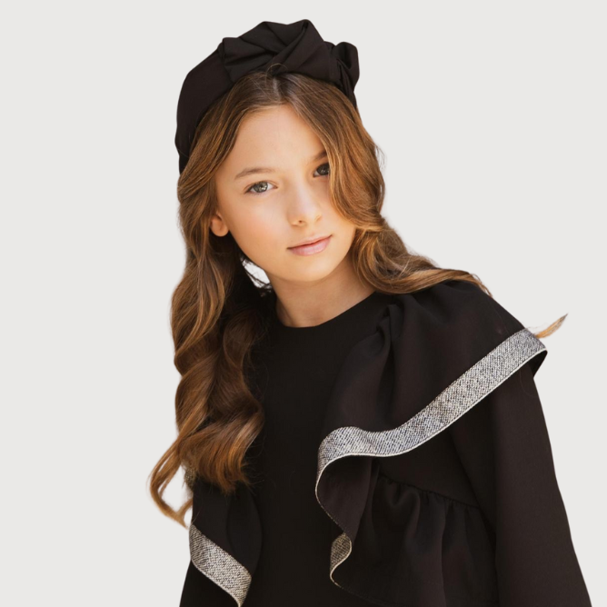 Su detalle distintivo es el gran volante con ribete plateado, que aporta un contraste luminoso y refinado, junto con los acabados cuidados que realzan su caída y movimiento. Un diseño versátil y cómodo que combina modernidad y clasicismo.