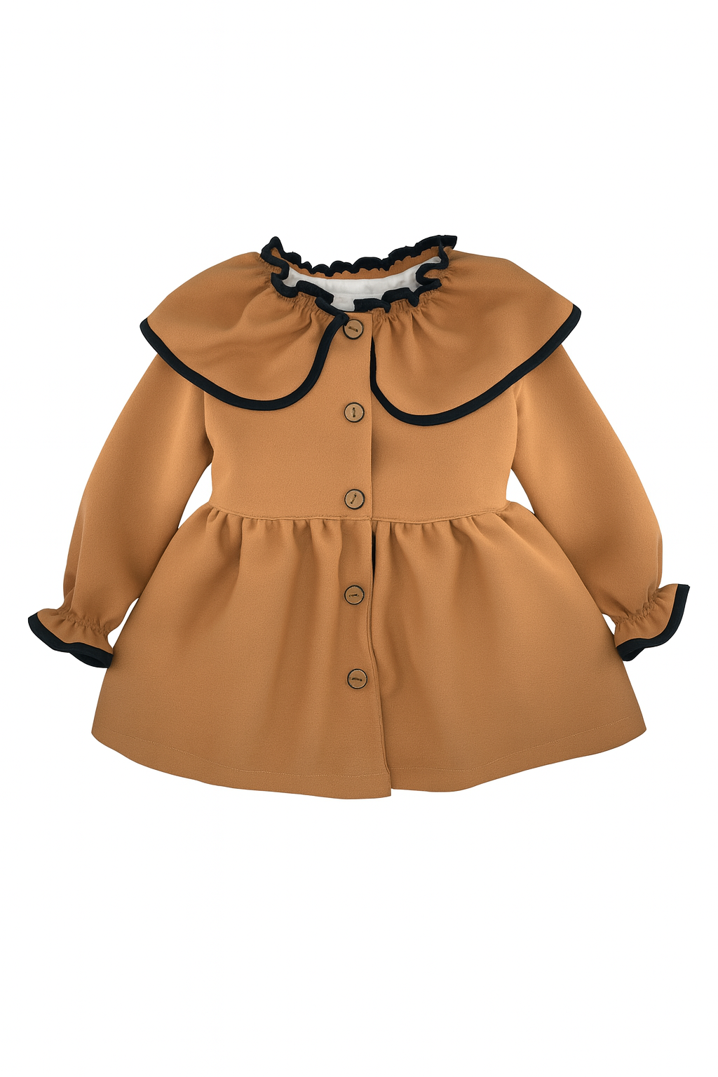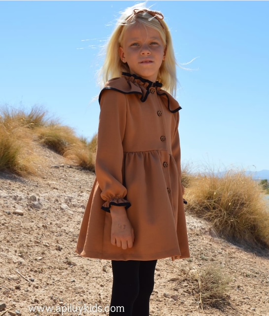 El detalle protagonista es su cuello volante con ribete negro, que aporta contraste y personalidad, junto con los acabados cuidados en las mangas que realzan aún más su encanto. Una prenda confeccionada con mimo que resalta la dulzura y la frescura de cada niña.